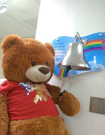 The REACH child cancer mascot "Eddie Bear" is named after Eddie the "E" in REACH. Eddie Bear is part of the team and is present at most charity events and gets involved in lots of REACH child cancers promotions and outings. He can be rather mischievous so keep a look out for him around New Zealand. Eddie Bear is pictured ringing the end of treatment bell in CHOC. REACH child cancer's aim is for each child diagnosed to be able to ring the end of treatment bell through increasing research into child cancer by creating new and better options for children diagnosed
